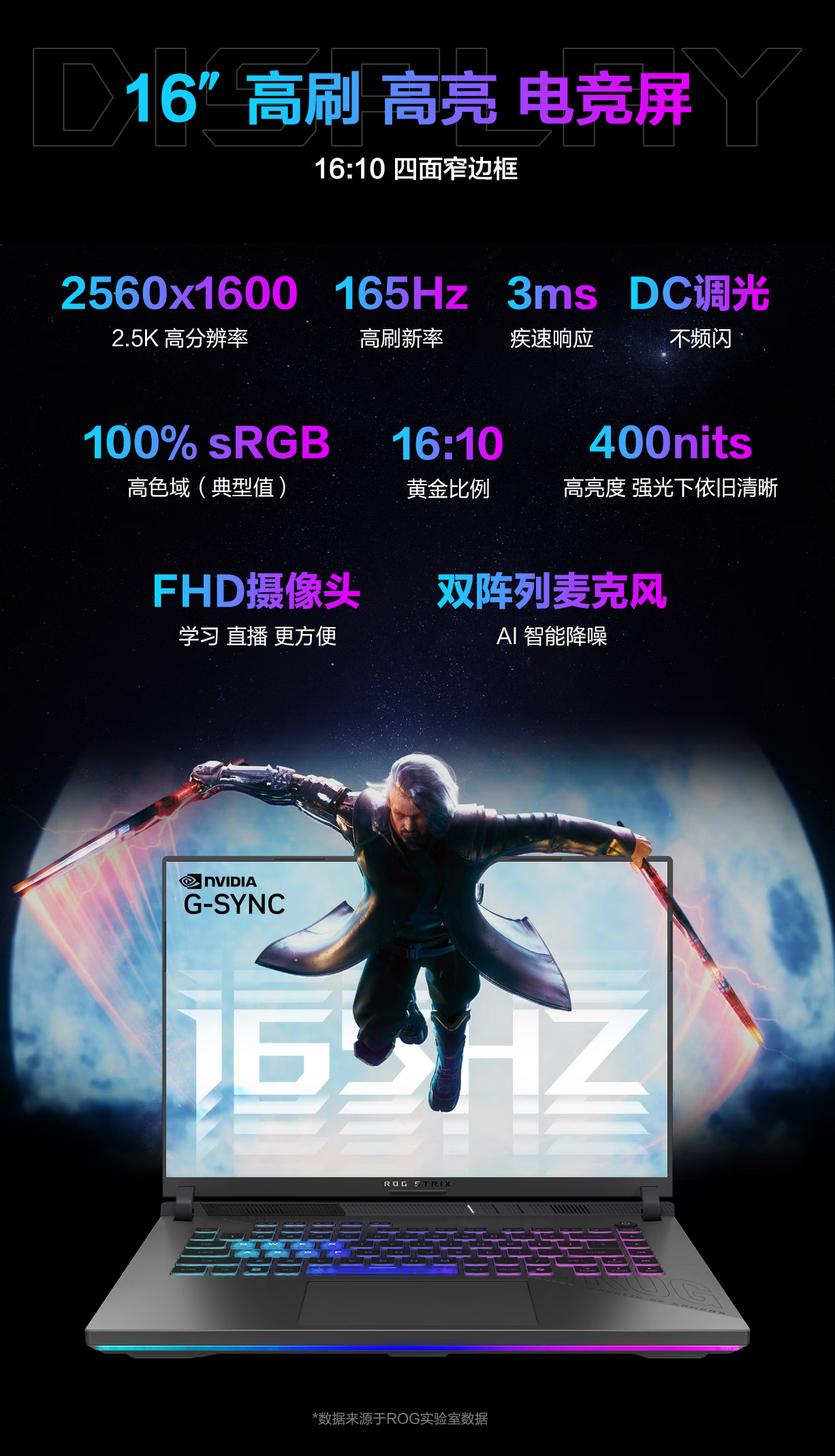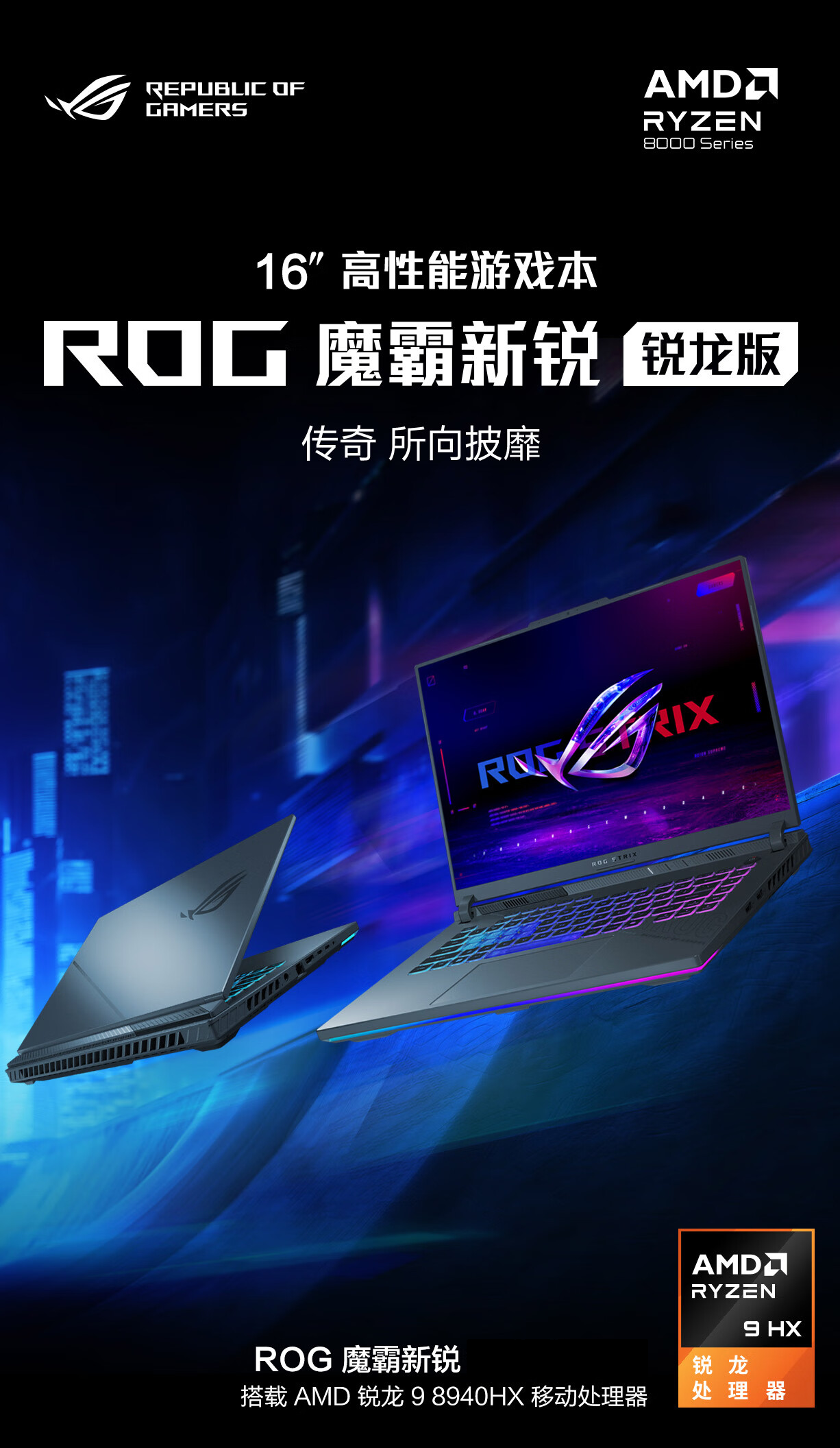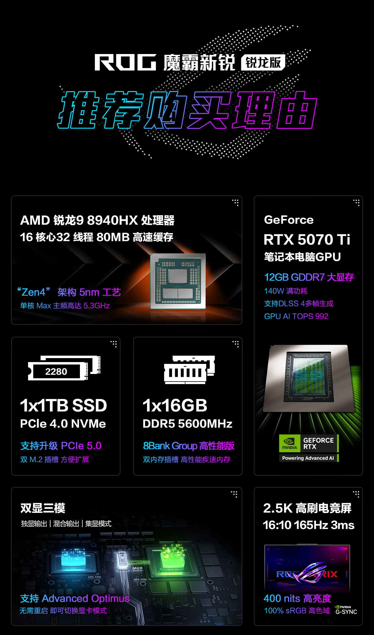 华硕rog魔霸新锐 16英寸高性能电竞笔记本游戏本电脑 锐龙R9-8940HX处理器 16G内存 1T固态存储 RTX5070Ti-12G 2.5K 165Hz刷新率