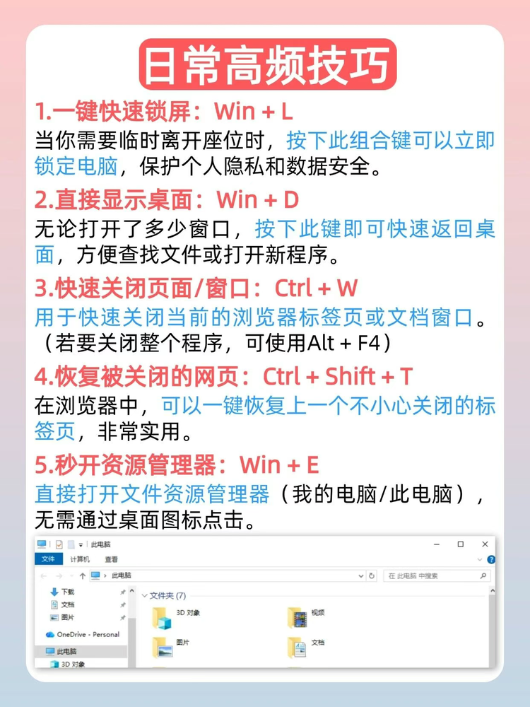 学会使用Windows组合键 工作翻倍 省时省心 更多系统技巧尽在计算机应用培训班发表时间:2026-01-08 15:11 大多数学员只知道复制Ctrl+C,粘贴Ctrl+V?来试试这22个电脑技巧!从日常高频技巧到进阶操作,让你告别抓瞎,办公效率起飞! 日常高频必须会 1临时有事离开电脑,Win + L:一键锁屏,防止误操作。 2关掉资料网页,找不到,Ctrl + Shift + T:一键恢复网页。 3桌面文件太多找不到“此电脑”,Win + E:秒开资源管理器,告别桌面找文件!