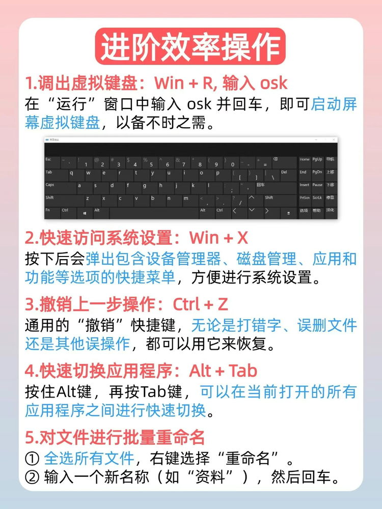 编撰效率要掌握 4写文案、做PPT误删了一大段,Ctrl + Z:撤销上一步,瞬间找回被删文案! 5多窗口来回切换,找不到需要的位置,Alt + Tab:逐个切换应用,迅速定位窗口! 6左右分屏看文档,Win + ←/→:一键分屏,左右对比各占一半。
