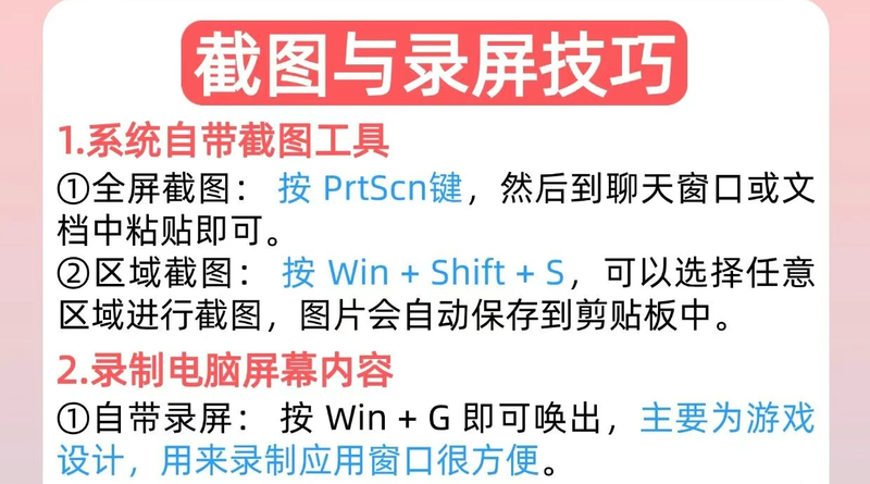 截图录屏有方法 9微信QQ截图有冲突,试试Win + Shift + S:系统自带截图,任意形状、精准捕捉! 10Win + G:呼出系统自带录屏,不用再用第三放。